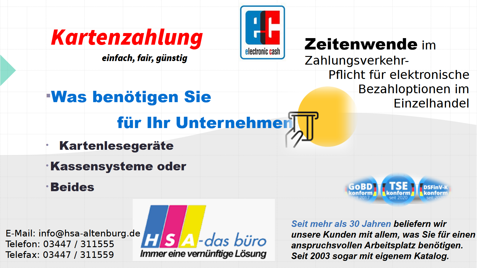 Unsere schnellen Kassen sind dank ihrer umfangreichen Funktionen und der einfachen Bedienungsweise für verschiedenste Branchen hervorragend geeignet. Ob als Kassensystem für den Einzelhandel, die Gastronomie, eine Tankstelle, einen Friseursalon oder in einem sonstigen Bereich. Unsere Kassen ermöglichen eine professionelle und schnelle Abwicklung der Verkäufe sowie der Bezahlvorgänge. Dadurch unterstützen wir Sie, einen schnellen und kompetenten Kundenservice am Kassenschalter, dem Point of Sale (PoS), zu bieten. Wir beantworten gerne Ihre Fragen rund um unser Angebot, damit Sie die richtige Auswahl für Ihren Einsatzzweck treffen. Tel.: 03447 311555 oder mail@hsa-altenburg.de